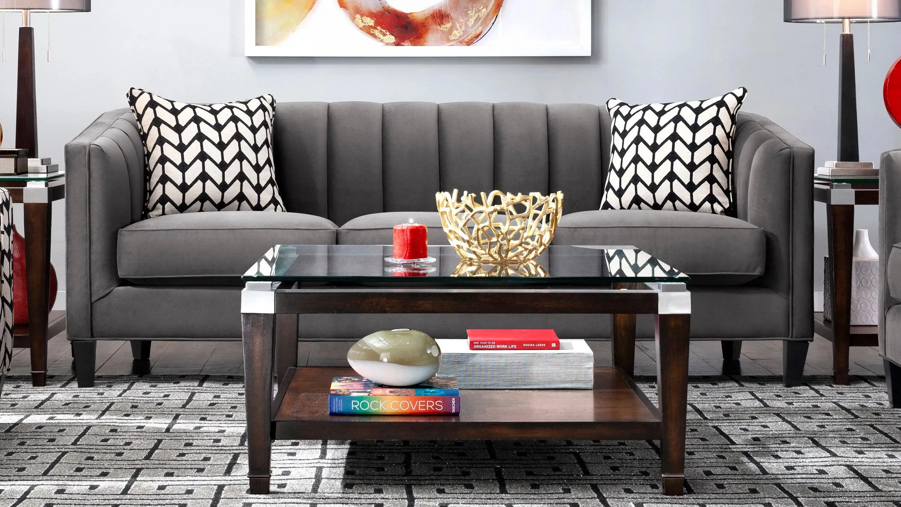 A unique coffee table can really draw in the personality of a room, and this glass coffee table will give your living room the touch of character it needs. Its warm walnut finish is accentuated by a 1/2 in. floating glass tabletop and brushed-nickel corner supports. The coffee table's lower shelf is the perfect place to add decorative accent pieces.