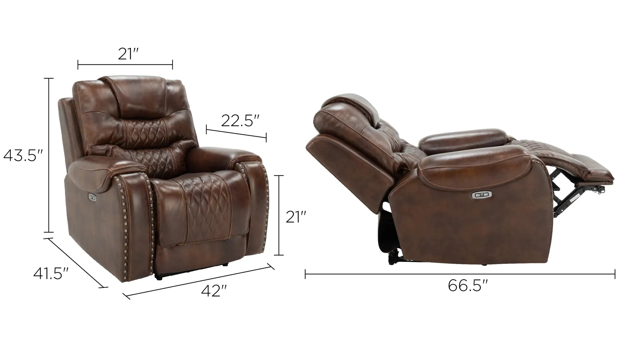 The power recliner is fully loaded with everything you need for relaxation. With power recline and power headrests with infinite positions, chilling at the end of a long day is super easy. Plus, the luxurious leather with diamond topstitching and nailhead trim are great design accents that add an extra element of visual interest.
